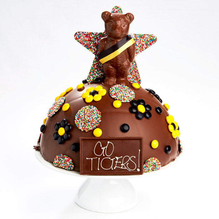 This is our large Footy Chocolate smash cake. Our AFL Football Team Chocolate Smash Cakes (Chocolate Pinata Cakes) are handmade to order. Personalise for your selected footy team with colour scheme, ribbon colour, and message hand-piped in white chocolate. This cake is also available in small.